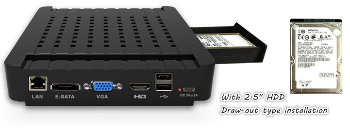 | HDD | HDD Port | 1 2.5” SATA HDD Port + 1 E-SATA HDD Port |